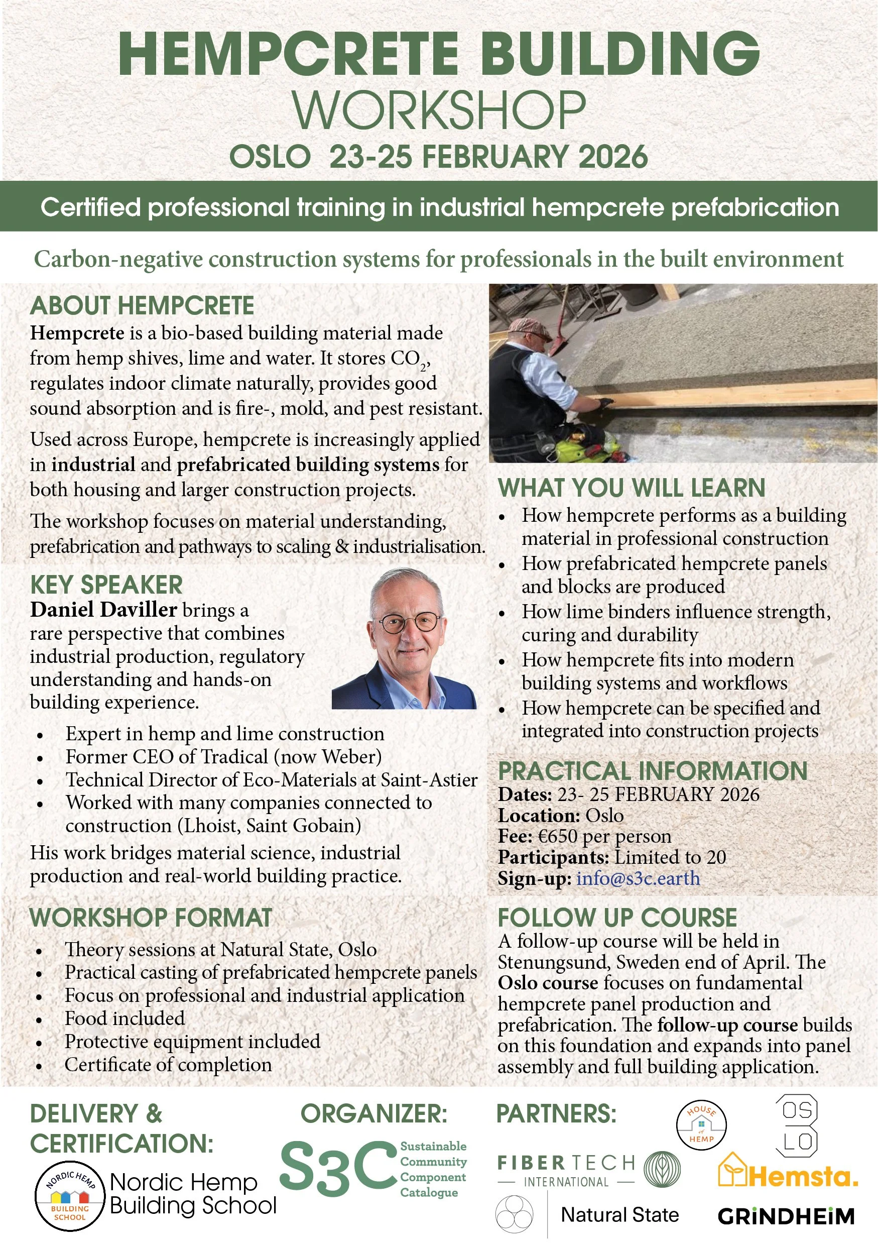Training is led by Daniel Daviller together with Peter Holmdahl and the Nordic Hemp Building School, bringing long-standing experience from certified hemp construction education and applied building projects across Europe.